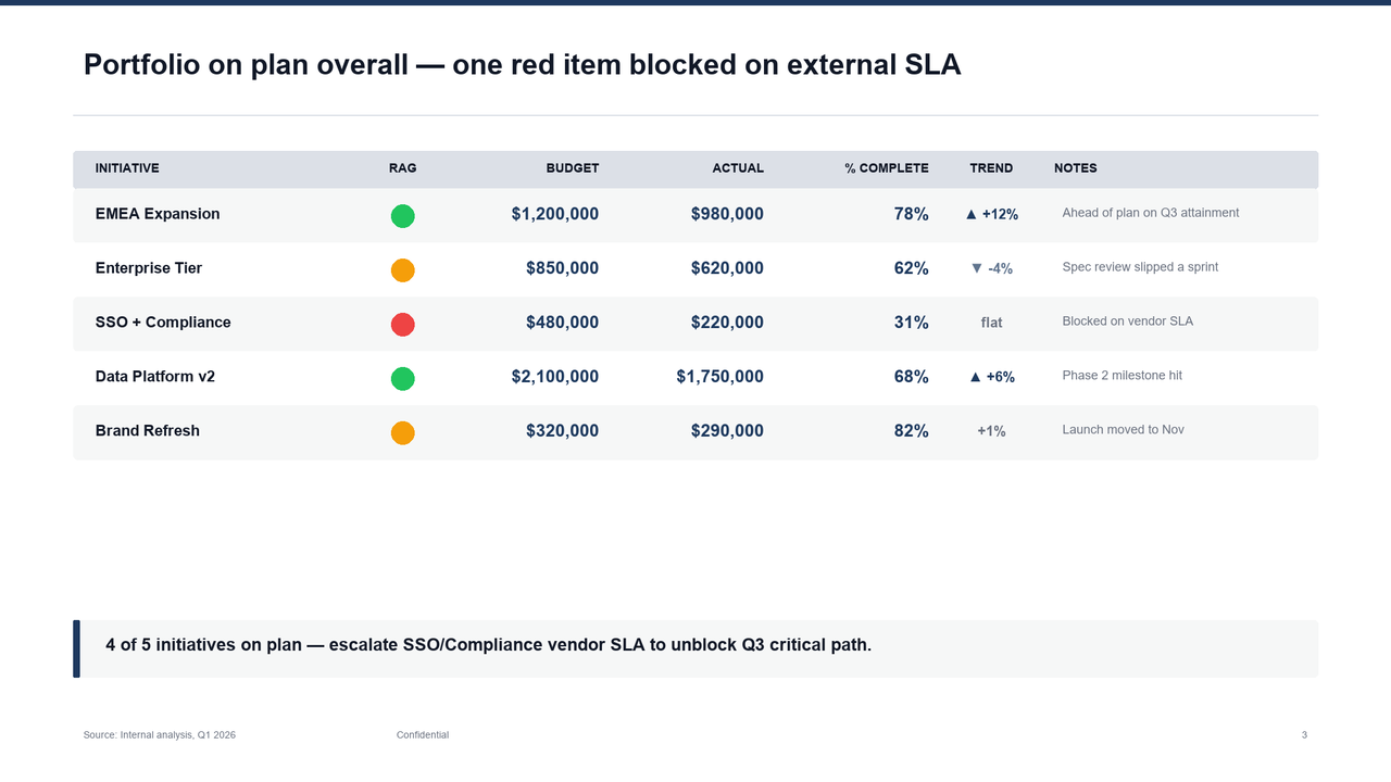 "title": "Portfolio on plan overall — one red item blocked on external SLA",