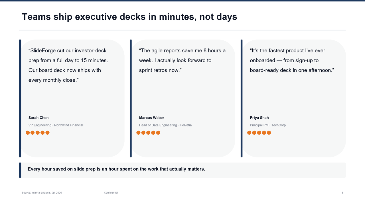 Customer testimonials from our top 3 accounts: Sarah Chen VP Eng at Northwind Financial says we cut deck prep from a day to 15 min. Marcus Weber Head of Data at Helvetia saves 8 hours per week. Priya Shah PM at TechCorp says it's the fastest tool she's ever used.