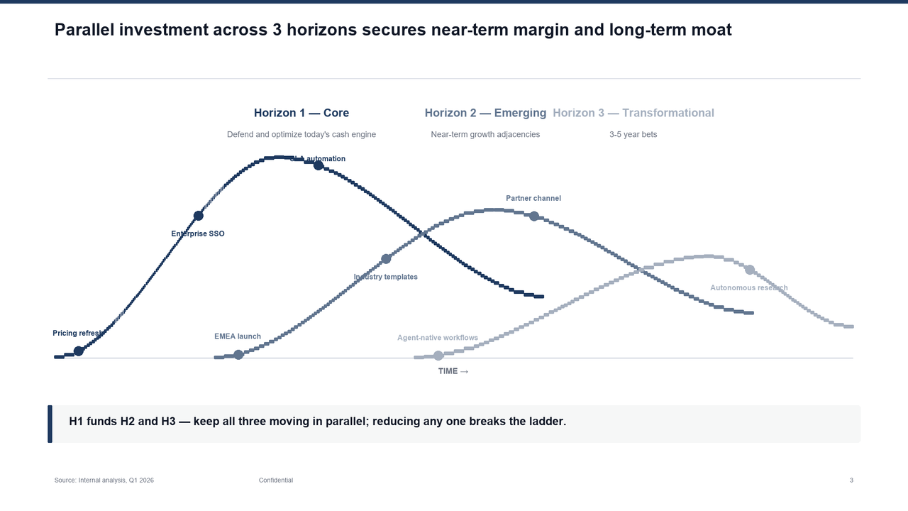 "title": "Parallel investment across 3 horizons secures near-term margin and long-term moat",