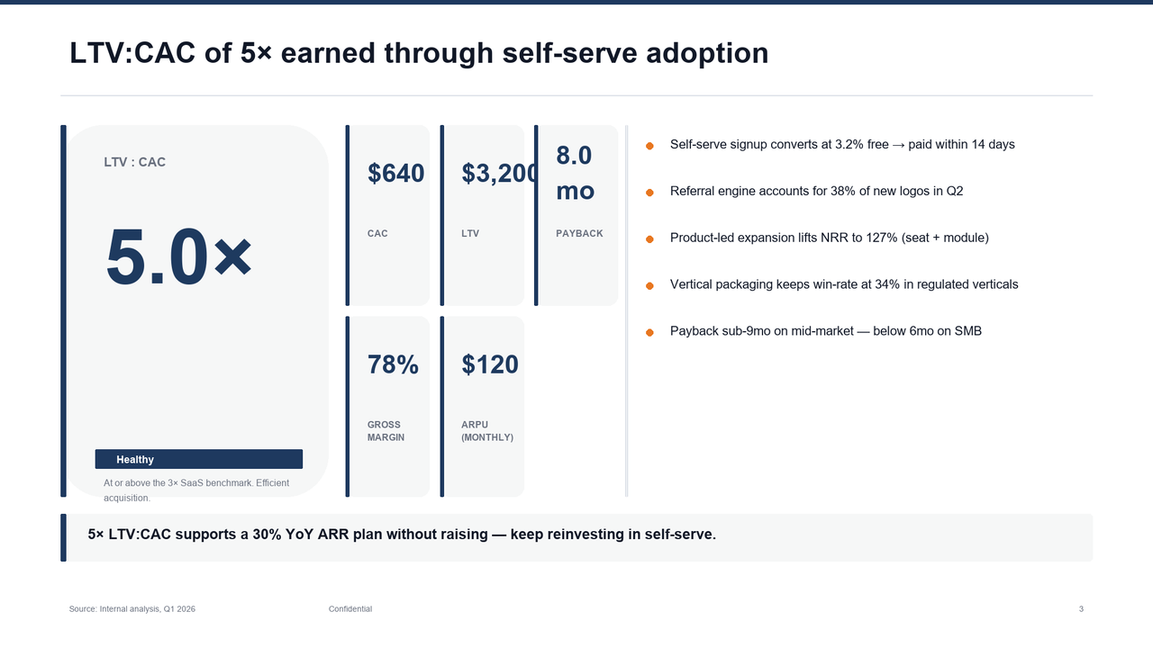 "takeaway": "5× LTV:CAC supports a 30% YoY ARR plan without raising — keep reinvesting in self-serve."
